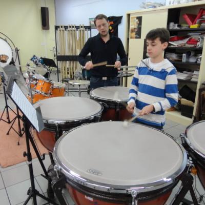 La classe de percussion de l’école de musique est composée d’à peu près 30 élèves qui pratiquent donc la percussion classique (caisse claire, xylophone, timbales, vibraphone, marimba etc…) et accessoirement la batterie. Nous avons la chance d’avoir un gros parc instrumental, ce qui permet aux élèves de venir travailler à l’école de musique et de pratiquer la musique d’ensemble afin de participer aux diverses auditions.